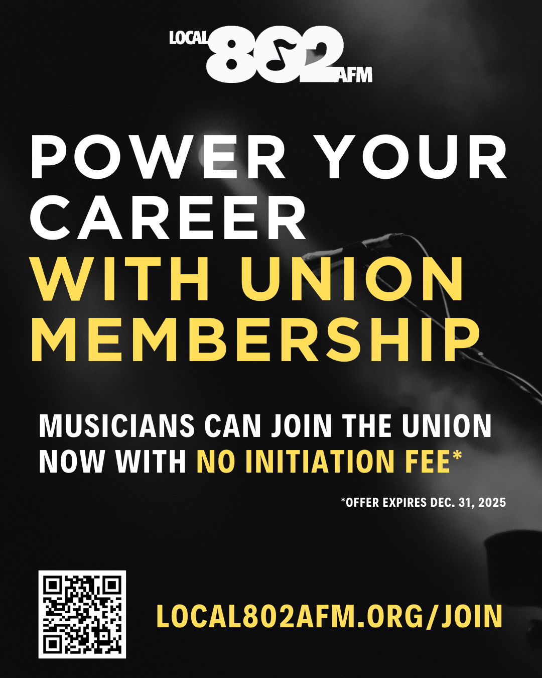 NEW MEMBER DISCOUNT: new members can join Local 802 from now through Dec. 31, 2025 and pay no initiation fee. Start at