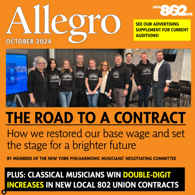 Local 802 has won first place in the country for its monthly newsletter Allegro (pictured above), which is read by professional musicians across NYC and beyond, as well as by many producers and employers. The union won for best labor electronic newsletter among local, state and regional unions.