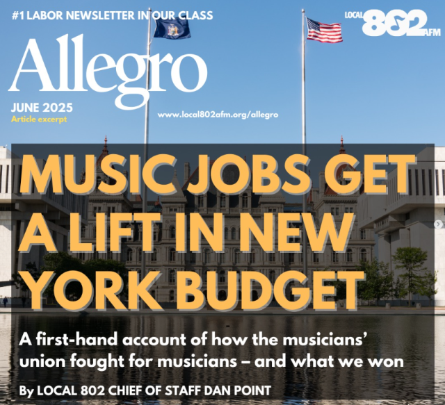 For the second year in a row, Local 802 has won first place in the country for its monthly newsletter Allegro (pictured above), which is read by professional musicians across NYC and beyond, as well as by many producers and employers. The union won for best labor electronic newsletter among local, state and regional unions.