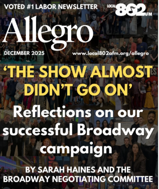 For the second year in a row, Local 802 has won first place in the country for its monthly newsletter Allegro (pictured above), which is read by professional musicians across NYC and beyond, as well as by many producers and employers. The union won for best labor electronic newsletter among local, state and regional unions.