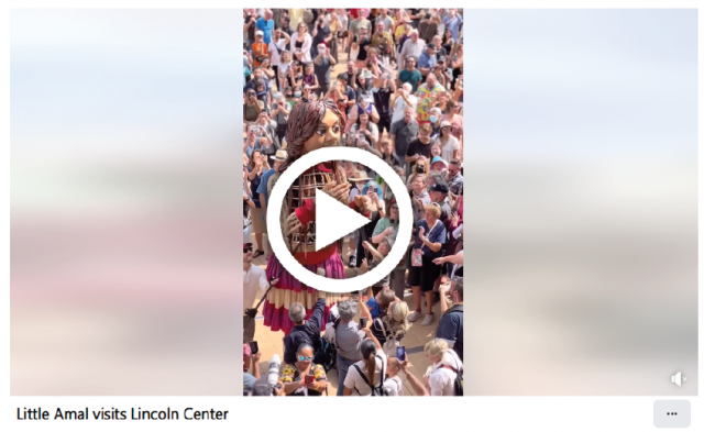Handspring Puppet Company’s Little Amal, a 12-foot-tall puppet directed by Tea Alagić, has become an internationally recognized celebrity. Following her original appearance as the biggest star of the 2019 Obie Award-winning play, The Jungle, Little Amal and her team traversed over 5,000 miles across Europe for The Walk project, drawing attention to the plight of childhood refugees and asylum seekers at politically charged public gatherings. Now, Amal journeys to New York City as a beacon of hope and a larger-than-life symbol of the American immigrant experience. Little Amal’s exploration of the Lincoln Center campus offers a powerful opportunity to see it anew, through the eyes of a refugee child who has just arrived here. Featuring a New Orleans style second-line parade led by Jazz at Lincoln Center musicians and music by composer Kareem Roustom and Antonín Dvořák. Learn more about Little Amal here.
