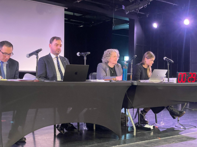 Over 300 people attended the Local 802 membership meeting on Feb. 4, 2026, where members passed four new bylaws. ABOVE: parliamentarian Evan Hudson-Plush, Local 802 President Dan Point, Financial Vice President Karen Fisher and Recording Vice President Sarah Haines