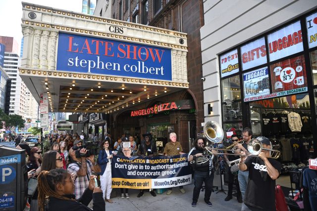 The event featured a parade led by Local 802 members of the Five Borough Brass to the Ed Sullivan Theatre followed by a Colbert lookalike contest judged by celebrity guests, giveaways for fans waiting in line for the show, and a delivery of more than 143,000 petition signatures to Paramount Global headquarters from fans and advocates pushing back on corporate capitulation and demanding Colbert stay on-air. In tandem with these events, MoveOn launched a billboard in Times Square projecting “You Can’t Cancel the Truth: Keep Colbert On-Air.”