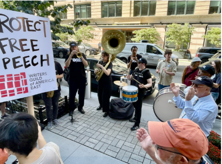 First, in early September, Local 802 took part in a joint celebration/demonstration organized by MoveOn that honored the 10th anniversary of “The Late Show with Stephen Colbert” – and also demonstrated against CBS’s cancellation of the program days after Colbert called out Paramount Global’s $16 million settlement with Donald Trump. Musicians who perform on the show are members of Local 802 covered by an AFM contract.