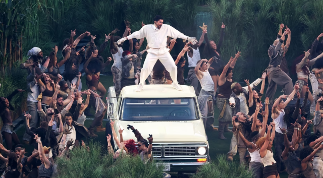 Bad Bunny at the SuperBowl halftime show, highlighting a joyful community of Puerto Rican culture and resistance.