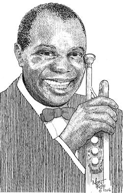 Jazz artist and Allegro contributor Mort Kuff recently penned these illustrations of the Count Basie band (above) and Louis Armstrong. Kuff told Allegro: “When it comes to celebrating Black History Month in terms of jazz – America’s classical music – I believe it is safe to say that the incomparable LOUIS ARMSTRONG and the fabulous COUNT BASIE (and his rhythm section) would be found very near the top of any list. The story of Louis Armstrong as a musical phenomenon is well known. It would be hard to argue that any other single musician has had such a powerful influence on the world of popular music. His upbeat personality, his nonpareil virtuosity and his dazzling style plus his own and often hilarious vocal improvisations are all deserving of a high note in anybody’s book. The fabulous Count Basie rhythm section consisted of ‘The Chief’ at the piano with his impeccable taste and scrupulously perfect tempos; Walter Page and his rich, dependably firm bass; Jo Jones on the drums & cymbals, who pioneered the way for all big band drummers to follow; and Freddie Green’s consistent four-to-the-bar rhythm guitar work that was a vital element in establishing the band’s pulse for nearly 50 years. Playing together, this quartet of fabulously talented musicians provided the solid foundation for the Basie Band that, in turn, set the gold standard for the swingingest orchestras of the Golden Era of the big bands.There has been nothing like it, before or since.”