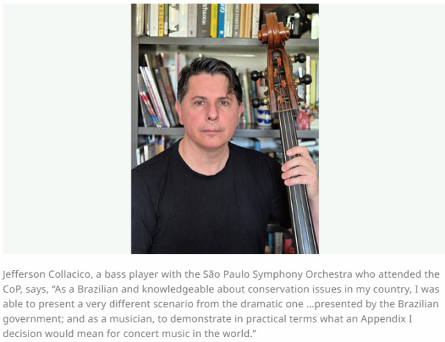 Jefferson Collacico, a bass player with the São Paulo Symphony Orchestra who attended the CoP, noted the tension around the issue. “Since the COP deals with very varied subjects, many details can be missed and the discussions are, let’s say, emotional. The Parties that were aware of the barriers to travel for musicians immediately opposed the Appendix I listing. Countries without full knowledge of the implications for orchestras, however, supported it. Perhaps it is one of very few conservation problems in the world concerning a renewable resource directly affecting an entire class that has never participated in the trafficking or smuggling of the material.” Collacico was able to advocate successfully. “As a Brazilian and knowledgeable about conservation issues in my country, I was able to present a very different scenario from the dramatic one — that there are only 10,000 pernambuco trees in Brazil — presented by the Brazilian government; and as a musician, to demonstrate in practical terms what an Appendix I decision would mean for concert music in the world.”