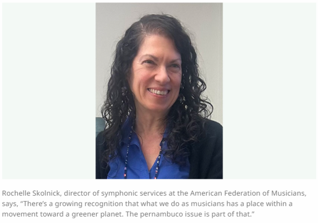 Rochelle Skolnick also believes that musicians have a role to play. “At FIM’s international conference in Sweden in October 2024, a topic of conversation was about what we and our institutions can do to better protect the planet. There’s a growing recognition that what we do as musicians has a place within a movement toward a greener planet. We have to be cognizant of the impact of everything we do on the physical and climate health of the planet. The pernambuco issue is part of that.”