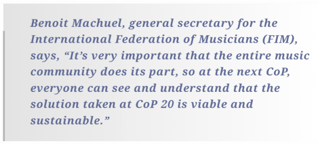 A U.S. Fish & Wildlife representative concurred, stating in an email: “The goal of the United States in the in-session working group was to explore options for supporting Brazil’s efforts to combat illegal logging and associated trade in pau-brasilia, while also protecting the ability of musicians to travel internationally to perform with bows (and other instruments) made from the species. The music industry stakeholders worked diligently with international partners in the lead-up to CoP20, and at the meeting, to ensure that their perspectives were considered in the decision making.”