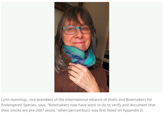 The work on traceability of bowmakers’ pernambuco stocks has already begun. Several countries, including Germany and France, have established national registries; the U.K. instituted one just before the CoP began. In the U.S., the approach has been voluntary. Bowmaker Lynn Hannings, vice president of the Alliance, says, “In 2007, when pernambuco was first listed on Appendix II, we were given some general information by U.S. Fish & Wildlife. Makers were advised to do an inventory of their legal stocks: how many boards, how many sticks, their weight; take pictures, date stamp the document, have it notarized, and put it in safe place. Because it was considered voluntary, some people never got around to it, but many did. For those that didn’t, they now have work to do to verify and document that their stocks are pre-2007 wood.”
